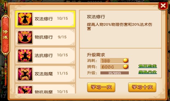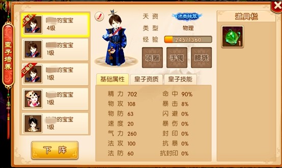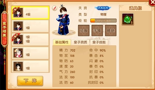1、提升修炼,增加人物、仆从、皇子的攻击力和防御力。