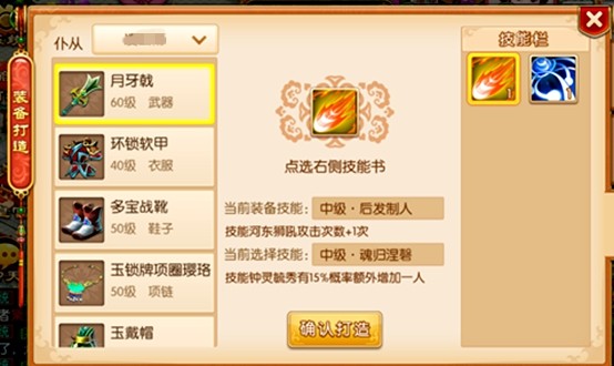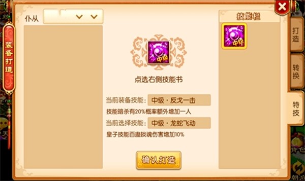 通过造办处打造的装备有概率自带中级特技,使用制造石可提升属性,增加特技概率。