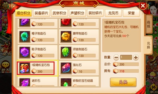 1、通过剧情掉落和积分兑换商城获得不同级别的宝石包,随机获得宝石。