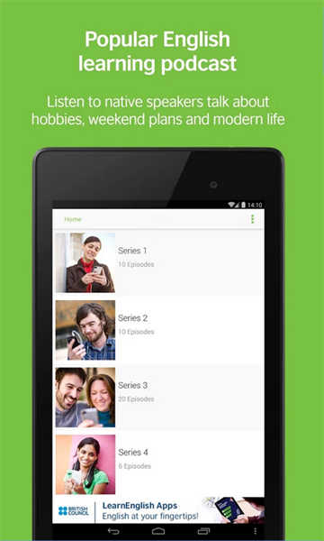 你可聆听由以英式英语为母语的人士所录制的日常会话,提高听力技巧。收听Podcast主持人Tess、Ravi、Adam 及Rob与不同人的对话,谈及不同的生活题材,如他们最喜欢的名人、周末好去处、晚餐派对和他们最想居住的城巿等。