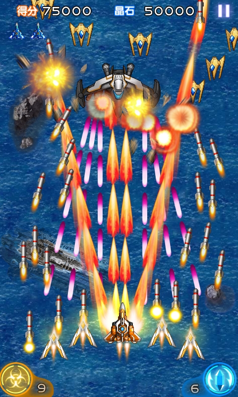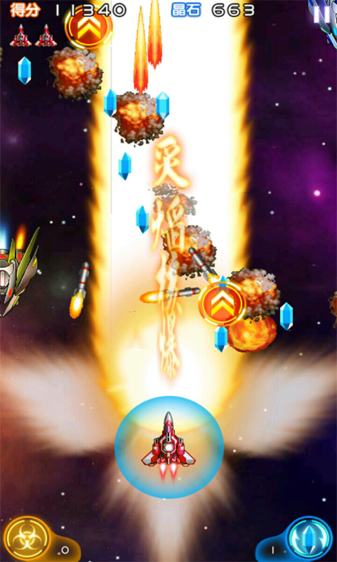 游戏屏幕右下角标有护盾的数量,这是个非常实用的道具。它可以把敌人的子弹变成水晶,尤其是在BOSS战的时候,把BOSS超大弹幕转换成水晶的时候非常爽快。水晶可以去升级机体,所以非常实用。护盾可以点击屏幕右下角主动释放,一定要选择敌人弹幕最疯狂的时候释放是最值的。另外比较好的设计是,如果玩家被敌人子弹击中护盾可以自动释放,转换敌人水晶的同时还给自己挡了一次子弹,相当于多了一条命,这是笔者最喜欢的道具了,非常实用。数量方面可以通过短信补充,2元补充5个护盾。