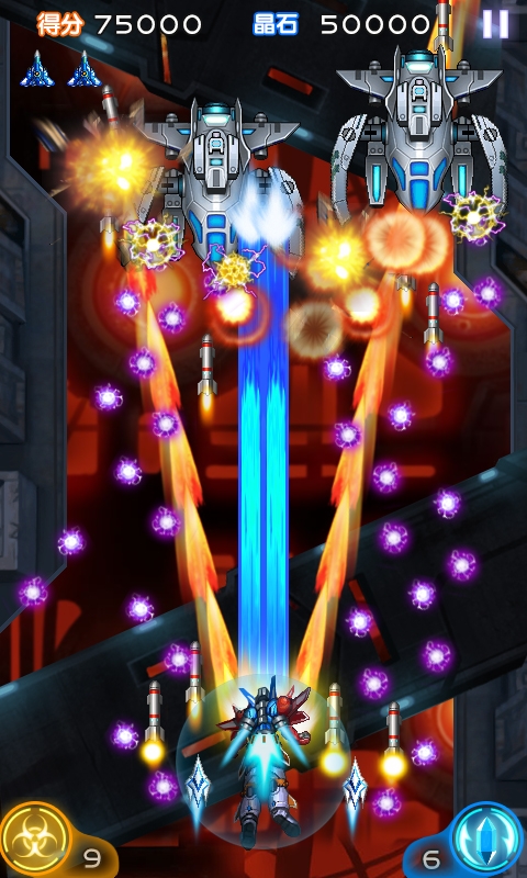 蓝色战机:激光类战机,攻击力最强但是打击范围只有正前方,所以需要频繁移动战机寻找目标,比较适合高手玩家;