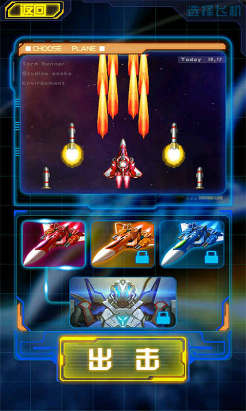 游戏中一共有3架战机和1架机甲战神,共4架战机。开始只能选择红战机,过了第一关之后可以选择黄战机,过了第六关可以选择蓝战机,之后散架战机可以组合成机甲战神,组装需要一段时间,所以第十关就可以使用机甲战神了。当然要是着急在选飞机界面点击机甲战神也可以发2元短信提前开启机甲战神。4架战机玩法都不一样: