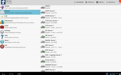 超级服务器Servers Ultimate Pro支持CVS、DHCP、DLNA、DNS、Dynamic DNS、Email (POP3 / SMTP)、FTP Proxy、FTP、FTPS、Git、IRC、ISCSI、 MySQL 、NFS、NTP、 PHP and Lighttpd、Port Forwarder、Proxy、Remote Control、Rsync、SMB/CIFS、SMS、Socks、SFTP、SSH、Stomp、Styx、Syslog、TFTP、Telnet、Test、Time、Torrent Tracker、Trigger、VNC、Wake On Lan、Web、WebDAV、X11、XMPP等多种服务器