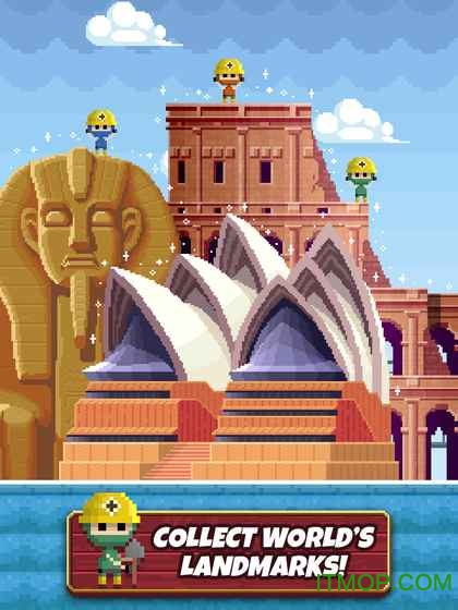 探索世界以及修建知名的世界性标志建筑。到处都是色彩缤纷的像素艺术,我们的英雄要为公主修建一个独特的别墅,滑动屏幕随着英雄们挖取黄金,用这些黄金建造别墅。