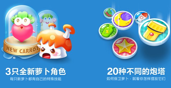 大家对游戏中的主角应该已经很熟悉了吧,那只可爱呆萌的胡萝卜小朋友.不知道大家有没有感觉如果只有它一只萝卜孤军奋战有点孤独的感觉呢?这次游戏中可是考虑到了大家的需求哦,萝卜家族又新增了很多新的成员.本次游戏新增了一些魔法特效供玩家们在游戏中使用,有"全体减速"、"全体冰冻"、"必杀炸弹"等等,这些厉害的技能能够把怪物们耍的晕头转向,玩弄于股掌之上.嘿嘿,是不是非常神奇呢?