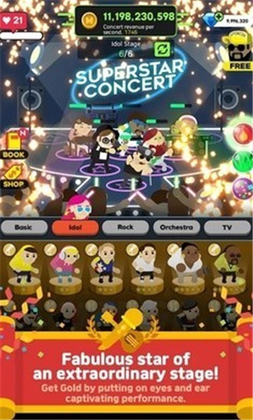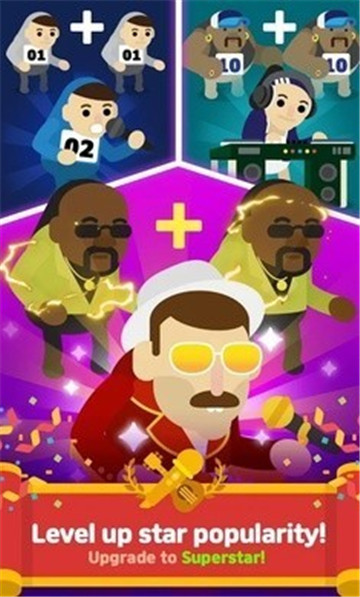 经营公司需要练习生,更高级的合并会获取稀有的艺术家,各种巡回演出等,就可以升级自己的偶像,无限金币任你免费使用,玩家可以合并2个相同的偶像成为一个更高级的偶像,非常有趣。