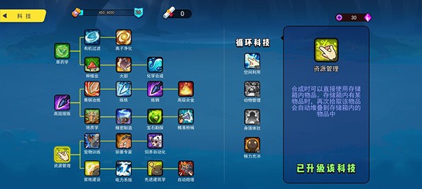 8、科技前期最实用的是资源管理(建好箱子解放背包)和宠物训练 后期能发电了就把驯兽专家先点了 实验台生产(高级饲料=蛋+奇异菇+芦荟) 还生产聚合物(琥珀靠雪地的松树爆)背包管理和精力充沛完全放弃一点都不要点,先进建筑学、自动炮塔、饲养自动化这三个点数有非常富裕时候再点,