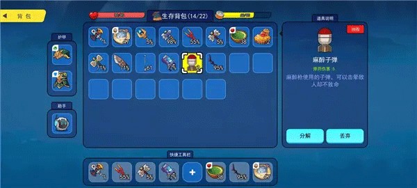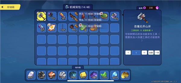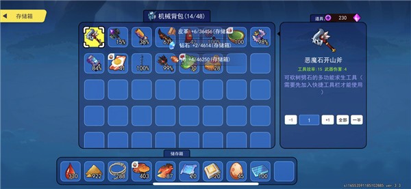 点了资源管理:前期其实并不会缺背包空间,只要你箱子够多把各种各样的物资放在箱子里采到的物资自然回到箱子里,至于单个物资上限还不太清楚(因为石头已经2000多了)