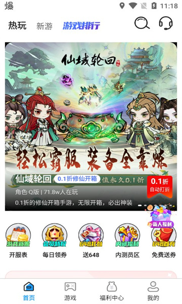 0.1折扣手游平台分享给大家,海量游戏让你0.1折就能玩,提供BT变态游戏、仙侠修真、三国等多种游戏类型,每天还有游戏礼包可以免费领,在线试玩游戏就能得金币,金币可以兑换各种礼品,不花钱就能畅玩手游,快来下载吧!
