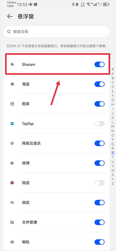 2.点击进入后找到音乐雷达软件,并将悬浮窗功能开启。
