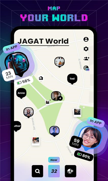 实时查看您的朋友在做什么!他们最喜欢的咖啡店是什么?你离目的地有多远,你的朋友移动得有多快?这一切都在 JAGAT 地图上!您还可以查看他们的电池百分比和在某个地方花费的时间