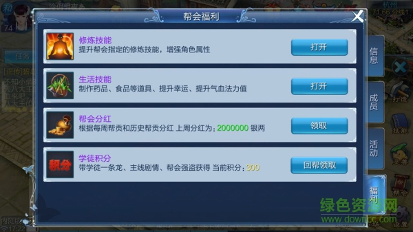 帮会成员可以在帮中学到各种辅助技能,如五禽戏,冥思,健身术,活力术等等,这些技能可以帮助玩家提高自己在游戏中的生存能力;