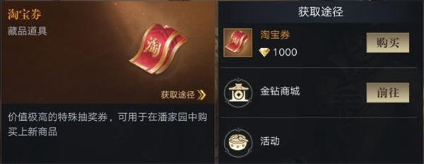 淘沙寻漏需要消耗淘宝券,淘宝券在金钻商城中消耗金钻购买,除了金钻购买之外也可以通过其他各种活动获取哟。