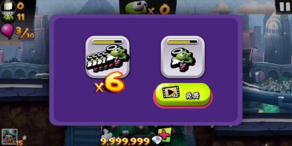 在僵尸尖叫中,玩家不需要控制僵尸的左右移动,玩家可以点击屏幕,让僵尸跳起来,当玩家单击一下则僵尸会跳跃起来,当用户长按屏幕,僵尸便会在跳跃到一定高度后,以一种滑行的姿态在空中滑翔一段路程。