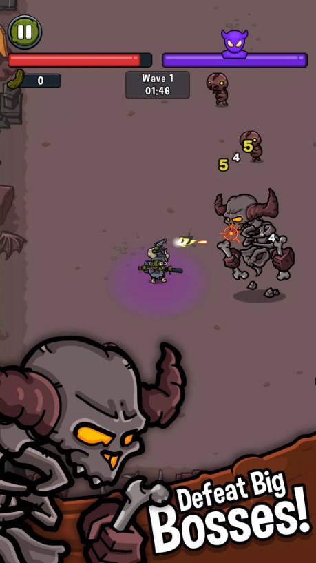 1、游戏中会出现各式各样的怪物和BOSS,需要你通过走位和不断增加自身实力才能活到最后。