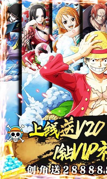 1.上线赠送VIP20,288888钻石,1000万贝利,1000战功。