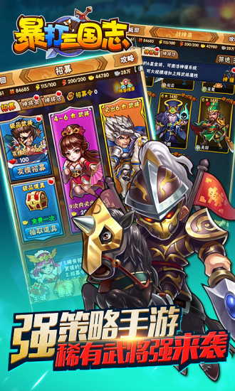 强 策略手游 稀有武将强来袭! 东汉末年,三国分立,烽火连天金戈不止,在那个世间争雄的年代,人命如草芥,群雄争霸,英雄辈出.《暴打三国志》便是以三国历史为蓝本,经数年研发而成的一款休闲娱乐类卡牌游戏.游戏将带大家进入三国战乱时代,玩家用自己的威望与实力招罗天下好汉,只需要手指轻轻点触屏幕即可暴打三国群雄,提升自己的实力,不断打败历史武将,让着名英雄人物臣服.