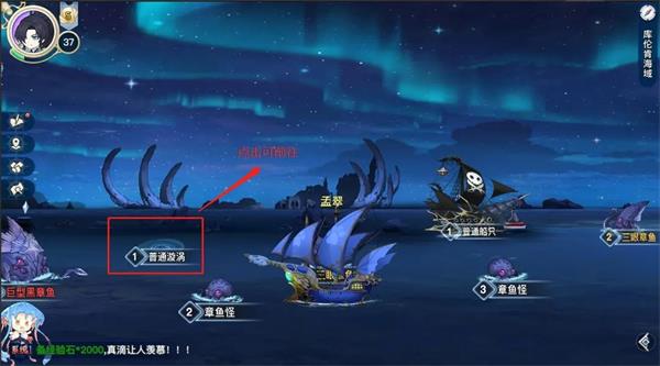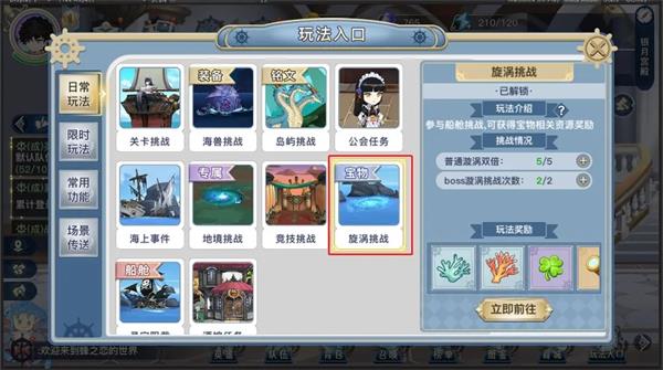 游戏内目前有三个海域,会随着主角等级的提升逐渐开启,每个海域中都会有不同等级的旋涡。进入旋涡后,消灭该所有波次的怪物,既可获得【图鉴卡片】、【宝物道具】、普通珊瑚、高级珊瑚道具奖励。旋涡中每波战斗,会有一些胜利限制条件,如果挑战失败了,小伙伴们可以通过替换船技或站位,说不定就可以打过了。