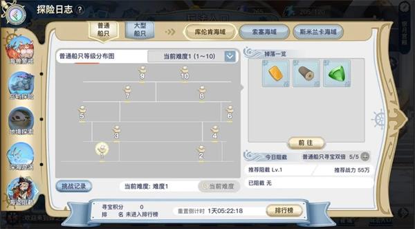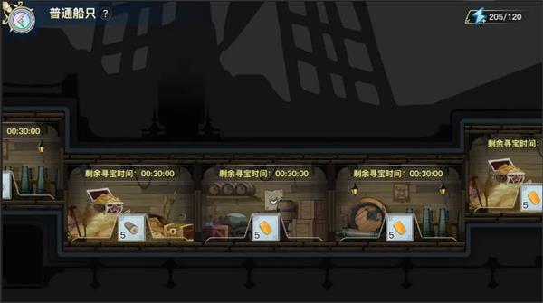 【玩法入口】界面中,点击【寻宝阻截】按钮可以显示寻宝详情,系统每天05:00会重置免费的普通船只寻宝和大型船只寻宝次数,记得多上线挂机领取奖励哦。