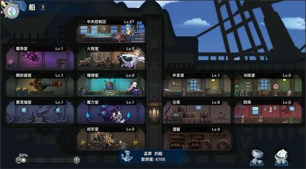 船舱系统开启后,主界面点击主角,再点击【船舱图标】后,就可以进入到船舱界面,在船舱界面中, 花费【黄铜】和【杉木】材料,可以提升船舱等,船舱目前分为两个类别: