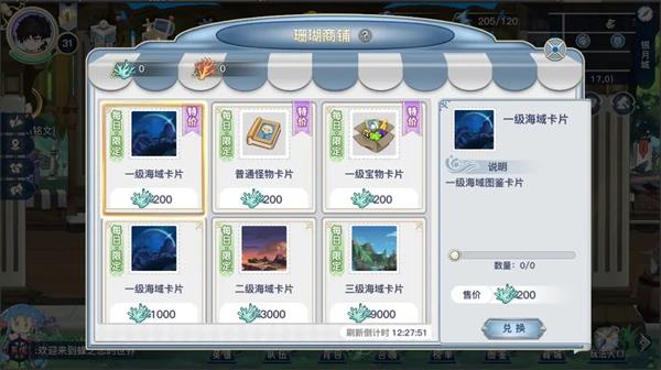 旋涡挑战中获得的【普通珊瑚】和【高级珊瑚】资源,可以在【珊瑚商铺】中,兑换不同等级的卡片资源,提升探险图鉴的加成值。