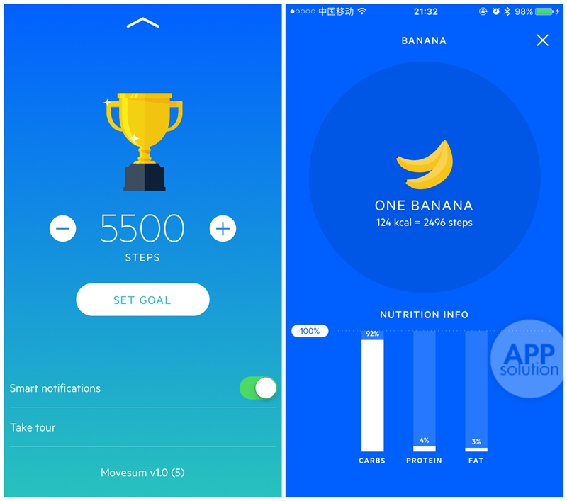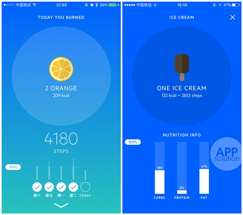 Movesum 设计简约,蓝色的主色调和深浅变化十分精致美观。它能将用户每天步数所换算的卡路里以食物形象来配对,卡路里的换算能让用户清晰了解当天消耗的食物种类,并且在日后饮食上产生控制意向。