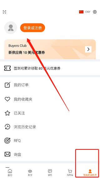 1、打开AlibabacomAPP,在“我的阿里巴巴”界面点击登录或注册;