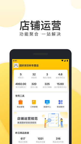 团好货商家版app是一款美团官方最新推出的店铺管理软件,拥有全面完整的店铺管理系统,功能全面,用户通过app一键对商品进行管理,轻松经营日常,在线查看订单详情,急速处理,实时掌握最新的店铺信息。应用介绍【美团团好货商家版】美团团好货官方推出的手机版店铺