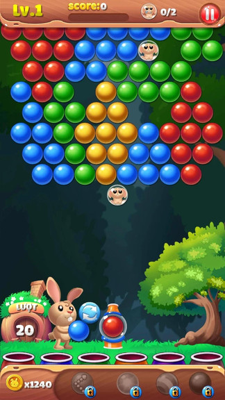 泡泡兔救援最新版 是一款消除类游戏。在这里游戏画面非常的可爱、色彩丰富,有一种在森林里的感觉。对准不同颜色泡泡来射击消除,尽可能每次的操作多消除一些泡泡,对你的闯关有更大的帮助。