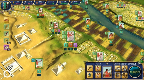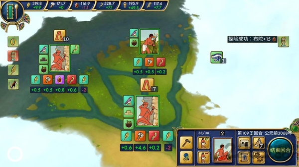 中期。探完部落地图就能探全埃及的地图了,接着疯狂探全埃及的地图,虽然探了也没用,但等同化天赋点出来就能一统部落后,就能用荷鲁斯的技能——30奢饰品换4点好感度,差不多600多就全埃及地图好感满了,150回合不到就能统治全埃及。但不要急,由于有那个税收下降的debuff,先别同化其他部落,用交易就行,等debuff消失后统一。