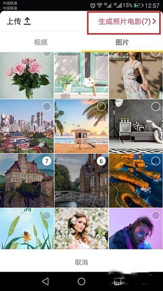 4、第四步选择要生成视频的图片,点击右上方的“生成照片电影”,需要注意的是选择照片要大于1张,如下图所示: