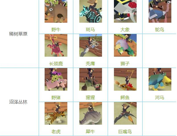 牛仔马(斑马跑1200m)绅士仙鹤(仙鹤收集三个灯笼)蛟龙(骑猴子24秒)斑点穿山甲(换乘八种不同动物)熊猫格格(地图边缘的塔楼旁边)
