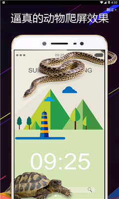 动物爬屏;可以在手机屏幕上养宠物,选择您喜欢的小动物,如猫咪、兔子、乌龟等在桌面上生活。还有蛇爬行、狮子吼叫等情景。