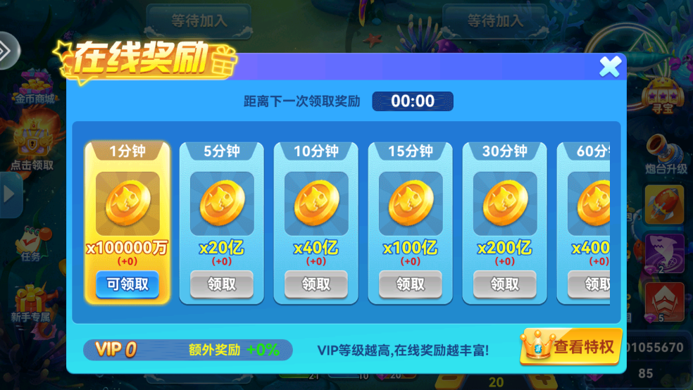 4、别忘了领取定期发放的金币福利,助力你快速推进捕鱼之路。