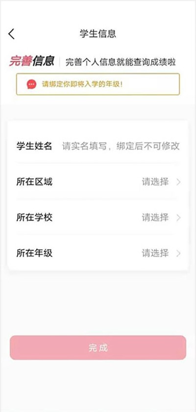 6、输入更改新信息,姓名,学校,年级,点击完成绑定,绑定后不可修改信息。