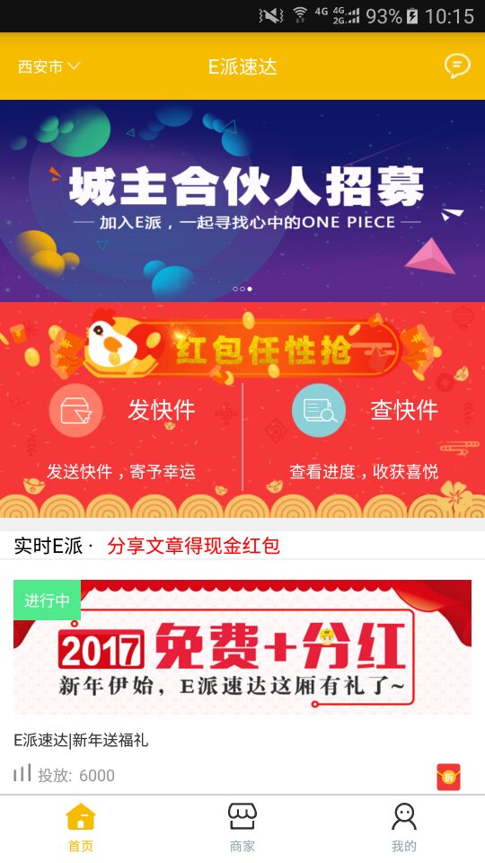 3.E派速达城市化生活服务快送平台,可发布快送任务和及时查询操作。同时也可注册成为快送员,获取附近送件订单信息,利用空闲时间赚取额外收益。