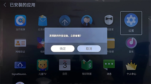 4、成功开启后,将U盘插到电视上,会弹窗提示发现外接设备,选择【确定】进入查看