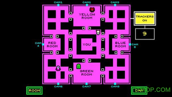 注意你的安全摄像头。使用追踪器来定位复古坏蛋的位置。关上门,阻止敌人攻击你!