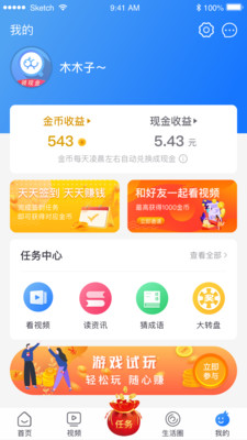 新增任务页面签到、看视频、看资讯、玩游戏等功能,做任务的同时可以获得金币;