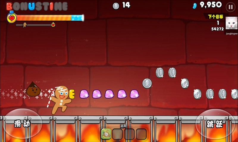 3、在跑酷期间玩家可以不断在奔跑过程中积攒道具获得生命值从而一直跑下去,让姜饼人逃离被吃掉的命运。