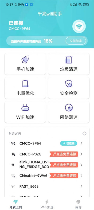 千兆wifi助手软件是一款专门优化安卓设备的软件,可以对于网络进行直接的优化和加速,解决部分网络遇到的延迟和速度方面的问题,同时还包括很多功能,比如优化电池等等,可以延迟相应的电池或者是手机的寿命,还可以直接进行缓存的清理,直接一键检验即可查询到这些问题,操作十分简单快捷,让更多的垃圾软件缓存都删除,优化手机让手机更加的快速运行。