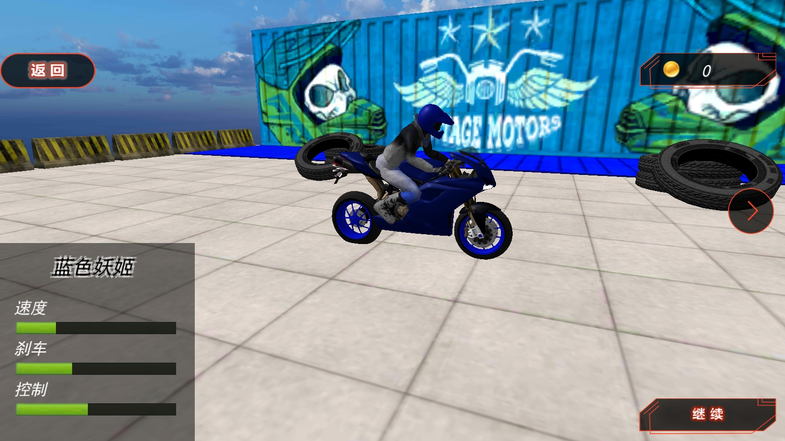 3、游戏会显示你的摩托车速度、刹车、还有控制,点击继续。