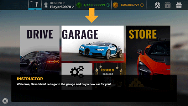 1、在下载安装真实停车大师游戏之后,来到大厅,根据游戏提示点击GARAGE进行冒险。