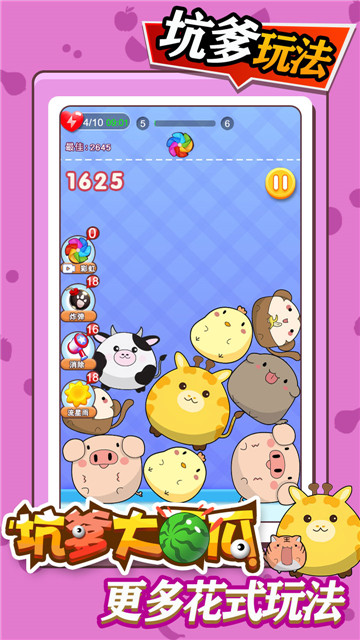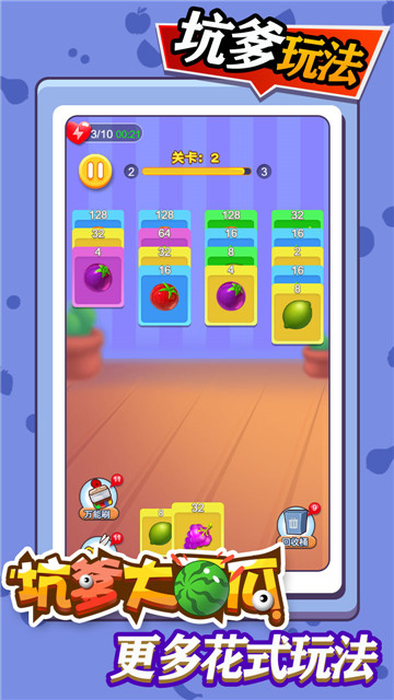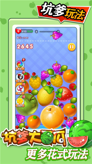 坑爹大西瓜这款游戏当中有着非常经典的合成玩法,随时在这里合成更多的水果,不断的寻找游戏的规律,才可以快速的完成更多的挑战。每一个场景当中的调整方法各不相同,可以在这里学习到各种不同的闯关技巧。