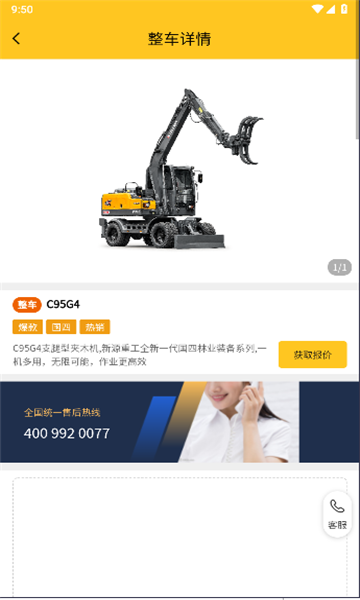 在商城界面中,您可以看到各种新源挖掘机产品丰富的信息,查看详情图片及性能参数等等,如果您想了解更多,点击客服按钮即可拨打官方电话与我们联系。