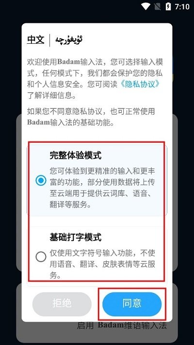 1、首先在本站下载维语输入法app,运行软件进去后,用户可以选择不同的模式(完整体验模式/基础打字模式),然后点击同意按钮