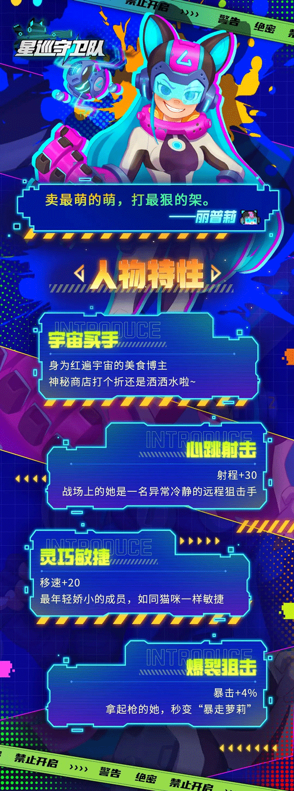 星巡守卫队 是一款像素射击rpg手游,游戏主线由多个小型的箱庭式关卡组成,玩家的任务就是在一个个小的箱庭世界中通过解谜、完成任务等方式来解锁关卡中的所有可解锁区域,游戏中的关卡中的解谜和挑战分为两种类型,一种是玩家需要观察当前谜题或挑战的运作机制来找到突破口,另一种就是玩家需要利用自己打造的武器来挑战敌人,不管采用哪种方法征服关卡,都能获得满足感。除了本身的RPG玩法之外,游戏中还有解谜、模拟经营、养成等内容以及翻滚、射击、随机彩蛋、策略BD等一众经典枪牢元素,关卡可玩性很高,再配上精致的像素风,能给玩家带来深刻的游戏体验,如果你喜欢像素风或者箱庭式关卡的游戏,那么请务必要来体验一下星巡守卫队。