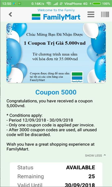 可以接收和兑换来自 FAMILYMART VIET NAM 的优惠券。