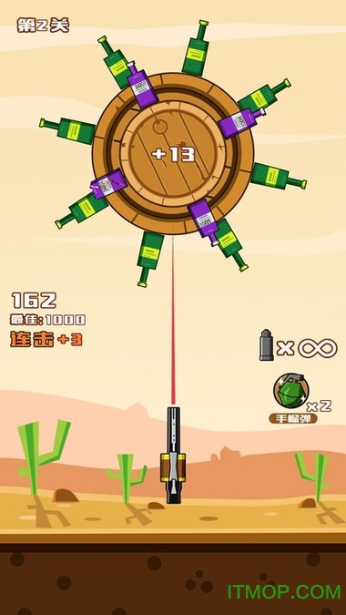 射击类的游戏,这款游戏玩家的角色是一名牛仔,游戏的整个画风给人一种酷酷的感觉,当然也不失可爱。用枪射击圆盘上的酒瓶,全部击中即可通关,每一关的设计和模式都不太一样,不同的瓶子需要射击的次数也不一样,连续击中分数加倍,还有各种装备等着你解锁。